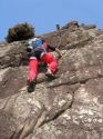 Placca del secondo tiro, dopo il cespuglio si vira a sinistra per poi rimontare fino allo sperone in alto sulla destra
