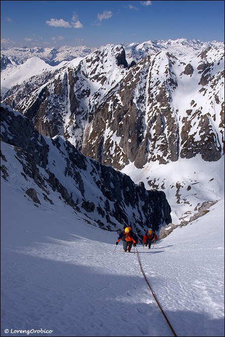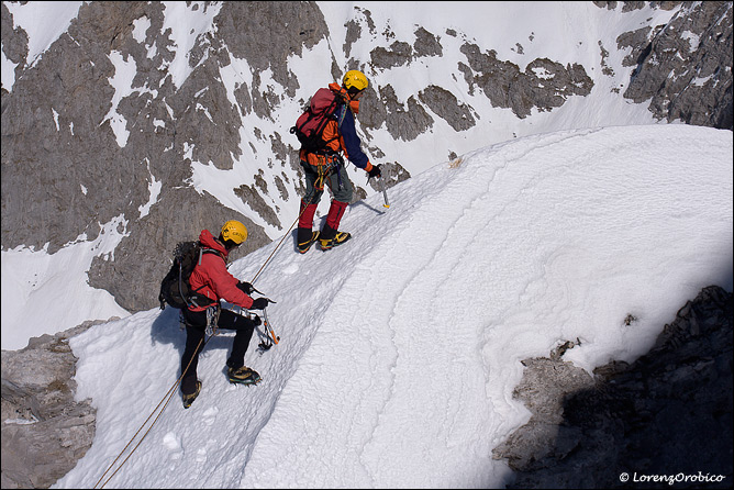 nella goulotte iniziale il primo sale sprotetto, e recupera il secondo su un bel friend camalot n.3 (azzurro) in un bucone, a prova di bomba |