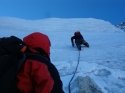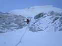 Dalla crepaccia terminale si risale per 50m il pendio che porta in una zona di roccette(a inizio stagione possono essere coperte)si superano,passaggio di III,poi per altro facile pendio di 40m si arriva alla base dell'imponente seracco.Si supera un primo tiro di corda da 40m con pendenza a 70°-75°e si sosta all'inizio del tratto più verticale.si superano questi 15m con pendenza a 85°-90° e si prosegue fino ad andare a sostare in zona piu appoggiata,35m.Un tiro più facile conduce alla base di un'altro muretto verticale,40m 65°.Si superano questi 5m a 90° per poi sostare comodamente nel pendio superiore.si superano gli ultimi 150 a 40°-45° fino al colle sotto la vetta dove termina la via.Da qui si raggiunge facilmente la cima. Discesa per la lunga via normale che passa per la Sella Freshfield (3 ore fino al rifugio). |