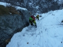 Raggiungerla lungo il suo alveo. L1 60m 60/65°, poi facile SG L2 40m balze facili fino alla SR in sx idrogr L3 60m 80° SR in dx idrogr L4 30m 90° per pochi metri poi facile. SR in dx idrogr. Discesa: Con 4 doppie sulle soste attrezzate su roccia, le prime due, scendendo, sulla dx poi sulla sx. |