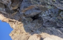 FOTO 1: Da dx a sx, si vede tutta la cresta SW che porta all'anticima; in giallo, la calata fino alla selletta dalla quale manca solo il facile tratto finale che porta in cima. In rosso, a grandi linee la discesa dalla via normale per tornare alla capanna Dosdé. FOTO 2: Il caratteristico passaggio nel "buco". FOTO 3: Dalla selletta, vista sul torrione che costituisce l'anticima dal quale si scende in doppia da 15m (cerchiata la catena per la calata). |