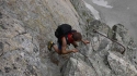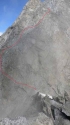 Seguendo i resti delle vecchie atrezzature in loco si attraversa ancora a destra su una serie di cenge e roccia ben salda fino a un diedro attrezzato (foto 3) Si aggira sul versante Val di Fumo un rialzo della cresta,ancora un diedro attrezzato con una grossa placca che sembra tenuta ferma dal cavo,da qui restando in cresta fino a una baracchetta distrutta posta al termine di un canalone.Un palo piantato indica la direzione e da qui salendo un tratto solitamente innevato fino all'anticima Sud presidiata da una diroccata postazione in cemento.