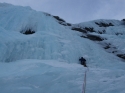 1°tiro.largo muro nel lato destro della cascata 75°-80°con muretti a 85°-90°60m.sosta su ghiaccio 2°tiro:una decina di metri a 65° portano alla base dellėimponente muro...lo si sale con pendenze costanti a 85°-90° per una quarantina di metri.55m sosta su ghiaccio 3°tiro:si superano ancora una decina di metri a 85°-90° e poi si prosegue pių facilmente.50m sosta su ghiaccio. 4°tiro:facile tiro finale a 60° 60msosta su albero o su ghiaccio Discesa:traversare verso destra fino all'arrivo della telegabina dove parte il sentiero che riporta a Pranzaira oppure con una serie di 4 corde doppie attrezzate sul costone roccioso a detsra della cascata.La prima sull'albero pių in basso a destra dell'uscita della diretta(cordini e moschettone),la seconda su spit la terza su suntone leggermente a destra e la quarta su chiodi. |