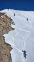 | Commento | Alla ricerca della neve. Si lascia l'auto dove la neve blocca la strada del G. S. Bernardo. Dopo qualche km sulla sedia stradale con le pelli, a circa 2000 slm s'imbocca lo splendido vallone che in poco meno di 3 km. fa salire oltre 1100 D+. Ieri arrivati in vetta senza rampant e ramponi, ma potrebbero essere utili su un traverso a quota 2750. Vetta con vista da urlo su Grendes Jorasses, M. Velan e M. Combin. In alto farinosa (ed infatti abbiamo ripellato), poi crostaccia. Con Giamma, Davide, Jack, Bicio, Roberto e Lorenzo. |