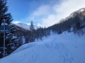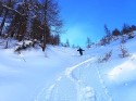 Decidiamo di salire su di un colle appena sopra S. Giacomo, proseguire oltre non ne vale la pena. Iniziamo la discesa tra accumuli e dossi ormai pelati. Nel bosco é possibile tirare qualche bella curva su neve profonda. Giunti a valle é ancora abbastanza presto quindi decidiamo di fare una sgambata lungo la valle verso il Nufenen pass, mentre il rumore di ulteriori slavine percuotono la valle. Proseguiamo per ca. 5-6 km. quindi con rilassante sciata ritorniamo al parcheggio, sono le 13 ma il termometro segna ancora -9°c. Rientriamo. |