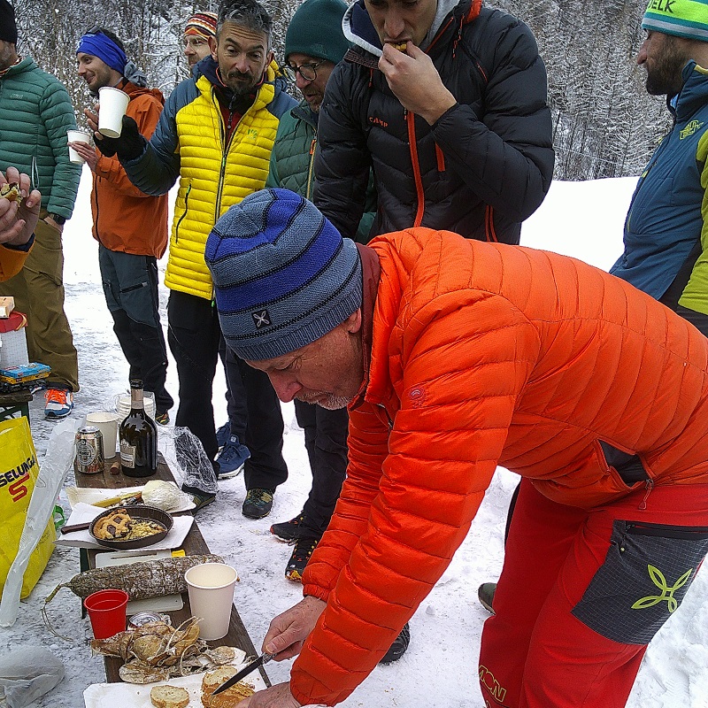| Commento | Controllo equipaggiamento, controllo incrociato A.R.T.VA. e PRONTI VIA per una salita con temperature rigide che garantiranno polvere fantastica, gradita dagli allievi e non solo. Alla partenza 15/20 cm di polvere su fondo duro, alle baite Tza de Flassin m.2250 la situazione cambia e il manto nevoso è indicativamente tra i 20/40 cm. che risulta interessante per le varie capacità di sciata. Tutti soddisfatti e per tutti almeno 1100 metri di dislivello superato. F1 Percorso e Fasi di salita e cambio assetto F2 Curve "discesa" F3 Momento conviviale di fine giornata. |