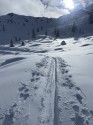 | Commento | Dai paravalanghe tracciamo il primo tratto fino a raggiungere il pianoro che porta alla stradina del toro, da qui entriamo nella traccia di un gruppetto che ci precede e che alternandosi lascia dietro un bel solco che sfruttiamo volentieri fino al passo.