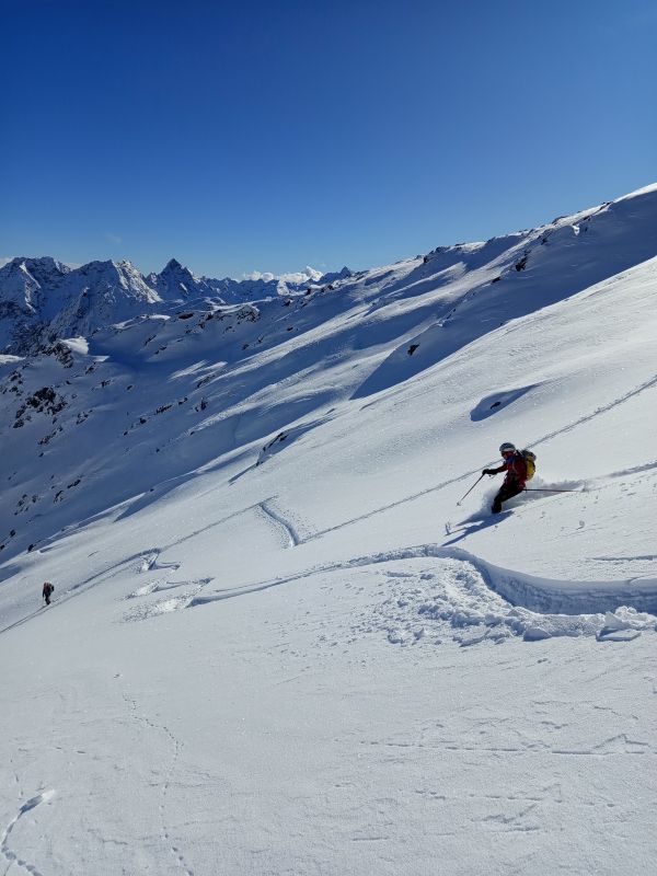 Il pericolo 3, la voglia di qualcosa di diverso dal solito e di conquistare una cima nuova mi hanno fatto scegliere questa gita, e direi che ci è andata più che bene. Gita dallo sviluppo molto lungo (19km a/r). Da Sfazù seguiamo la battutissima stradina che in circa 1h ci porta al rif. Saoseo e, poco dopo, alla località Camp. Fino a circa q. 2300m ampi pianori si alternano a pendii con un po' più di pendenza. Poi cambia decisamente e le pendenze si fanno molto belle, ideali per lo sci. Io e Andrea ci alterniamo nella faticosa tracciatura e finalmente dopo più di 4h raggiungiamo la vetta. I panorami sono mozzafiato, strepitosi. Ci godiamo una meravigliosa discesa in neve fresca fino a q. 2500m, senza toccare sassi; poi altri 100m con un po' più di attenzione. Il lungo Plan da Val Mera così come gli altri più brevi pianori, li percorriamo rimanendo nella traccia di salita, altri invece li scendiamo con qualche serpentina. Ma sempre con qualche grattatina, perché purtroppo la neve è molto farinosa e mancando il fondo, è inevitabile il contatto con qualche sasso. L'ultimo pianoro ci riporta a Camp. Da qui in poi scendiamo praticamente su una splendida pista grazie ai passaggi delle motoslitte, anche se la pendenza è molto dolce, fino alla macchina. Giornata top! Partecipanti: Fedora, Lidia, Andrea N. e Zamma. FOTO 1: Tracciando i pendii che portano al pianoro di Roan, dopo aver attraversato il sottostante Plan da Val Nera. FOTO 2-3: Stupenda neve farinosa scendendo dalla vetta. |