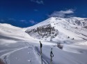 Dal colle si segue in regolare pendio che porta al Francaise Peloux. Dall'antecima scialpinistica ho tentato di risalire sino in vetta ma la breve cresta di discesa é piuttosto ostica e non ho ramponi e picozza, dopo un tentativo andato a vuoto, decido di iniziare la discesa. Primo tratto un po' ventato, sciata buona. Dopo ca. 150 m. di doslivello la sciata é eccezionale sino al piano dell'Alpe. Da qui si segue la ciclabile sino ad Usseaux con neve in via di trasformazione. Giornata splendida. |