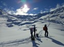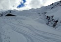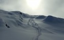 Ripelliamo 300m e poco dopo prendiamo la traccia di 4 skialper provenienti da Tartano, tornando così al colletto. Decidiamo di provare a salire in vetta alla Occidentale, mantenendo fedelmente la ripida cresta sci ai piedi. Fabio traccia molto bene e raggiungiamo la cima. Scendiamo con un po' di attenzione il breve tratto fino al colletto e poi giù di nuovo in una bellissima polvere in Val di Lemma, stavolta nel vallone più a dx, superiamo una baita e proseguiamo fin quasi al torrente, a q. 1850m, con neve un po' più umida negli ultimi 50m. Ultima risalita di 350m per tornare sul crestone che porta alla Cima di Lemma, per poi scendere verso San Simone. La crosta del mattino ha smollato e la discesa sarà molto migliore del previsto su neve marcetta, fortunatamente smollata. Sulla traccia del gatto torniamo al rif. Camoscio e quindi alla macchina. Decisamente un bel giro! Sui pendii completamente a N/NE/NW stupenda polvere. Partecipanti: Fedora, Lidia, Fabio V. e Zamma. FOTO 1: Le nostre 4 tracce della prima discesa in Val di Lemma, verso la Casera di Sona di Sopra. FOTO 2: Nei pressi della Casera di Sona, risalendo verso il colletto sotto la Cima di Lemma Occ. FOTO 3: La seconda discesa in Val di Lemma, nel vallone più a dx, ci fermiamo circa 100m sotto questa baita, nei pressi del torrente. |