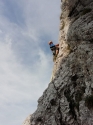 La via in se stessa non ha grandi difficoltà , non supera il III grado,con un passo di IV-,pero' son quelle cose che risvegliano la curiosità del bambino che c'è in ognuno di noi. La via si sviluppa su di uno spigolo a sinistra della via REFRATTARI , perciò arrivati all'altezza della cappella Savina, salgo per ghiaioni puntando all'attacco di quest'ultima.Alla base della parete non c'è nessuna indicazione , ma seguiamo questo spigolo poco pronunciato separato dalla Refrattari da un piccolo canalino che sale in parallelo per tutte le quattro lunghezze ( 20/25 m)che compongono la via . La prima sosta è su cordoni posizionati in due clessidre ;invece le altre tre sono attrezzate su due spit con anelli per la calata,come protezioni intermedie ci sono alcuni chiodi e cordoni in clessidra , ho portato delle protezioni veloci ma che non ho usato , perché comunque la roccia è ben lavorata e le difficoltà sono molto contenute . La discesa l'ho fatta con tre calate collegando gli ultimi due tiri. Via carina , ottima per chi è alle prime uscite in ambiente , peccato che siano solo quattro lunghezze ( magari curiosando la si può allungare di qualche tiro ). F 1: linea blu via Trentani , linea rossa Refrattari F 2: seconda lunghezza F 3: seconda lunghezza |