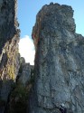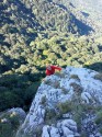 Avvicinamento: dal pas del Fo' seguire il sentiero per la ferrata, la via parte una decina di metri a sx della stessa (scritta alla base) L1: bella placca con un piccolo strapiombo nella parte centrale 5c L2: a dx, seguire lo spigolo molto con bella arrampicata 5b L3: dopo alcuni metri salto verticale di decisione, poi per rocce più articolate verso dx sino al prato in cima al torione a6+ a questo punto conviene traversare sulla torre Elisabetta e sostare poco oltre l'intaglio, alla base della Ghislandi L1: movimento difficile in partenza (e spit alto), poi si aggira lo spigolo a dx e con arrampicata continua molto esposta sino alla sosta (6a+/6b) L2: sulla vericale della sosta su roccia ottima, tiro di continuità (6b) discesa: sosta poco sotto la vetta verso la ferrata. con una doppia da 60mt. si arriva alla ferrata Note: queste due vie come la via dell'amicizia sono state recentemente richiodate a spit in chiave sportiva, per cui è sufficiente portarsi 14 rinvii (16 per la via dell'amicizia se non sbaglio). sulle altre vie in zona non so foto 1: in uscita sulla torre elisabetta foto 2:1° tiro della ghislandi foto 3: uscita in cima alla torre cai |