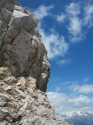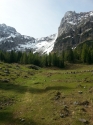 Da qui proviamo a salire la cima di Valmora, ma seguendo la cresta ci troviamo ai piedi di uno strapiombino molto esposto di roccia compatta (terza foto). Non sapendo cosa c’è sopra, ripieghiamo sulla cima di Leten. Passando su neve marcia, erba e ghiaietta, guadagniamo la cima, per poi scendere al passo del Re. Da qui torniamo alla malga lungo il pendio di neve e roccette. Brava Cinzietta alle prese con la sua prima ravanata doc! |