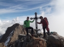 Il giorno dopo alle 4:15 partiamo, raggiungendo l’attacco del canale per roccette e neve. Le condizioni della via sono perfette: la neve è dura il giusto e la cascatella nella strozzatura è ancora di buon ghiaccio. Seguiamo l’evidente canale in un bellissimo viaggio su nel cuore della parete. Usciti alla forcella dell’Argentera, percorriamo una stretta cengia che con una placchetta di III grado ci porta sulla cresta finale. Da qui facilmente raggiungiamo la croce di vetta della cima sud. Siamo poi scesi lungo la via normale (cengia completamente pulita) passando dal rifugio Remondino e tornando al Gias delle Mosche. Segnaliamo che poco prima di iniziare a scendere, si è staccato uno dei blocchi che costituiscono la cima. E’ precipitato nel caminetto parallelo a quello con la corda fissa, creando scompiglio anche lungo la via normale. Se non ci fermavamo a fare qualche foto in più venivamo investiti in pieno! Nel complesso è davvero un bellissimo giro, percorso con Ale e Lallo. |