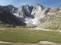 Il giorno dopo parto con Mario risalendo la costa sinistra (guardando la parete) del versante sud-ovest del Vignemale. Sorprendentemente troviamo una buona traccia con ometti, che percorre il ripido pendio di erba e sassi. Nella parte alta inizia a prevalere la roccia, spariscono sempre più frequentemente le tracce e si sale su facili placche di calcare. Raggiungiamo così la base del nevaio che porta al corredor de la Moskowa. Messi i ramponi risaliamo il pendio di neve dura, superiamo una bella strozzatura e virando a sinistra raggiungiamo la base del camino. Lo risaliamo su roccia buona fino a sbucare in cresta, quindi per ripidi sfasciumi raggiungiamo in diagonale il passo di Lady Lister. Qui, mentre Mario ripiega la corda, faccio un salto sulla cima del Pico Central. Tornato al passo, attraversiamo il ghiacciaio in direzione del Pique Longue (la cima più alta del Vignemale). Raggiungiamo facilmente la base della paretina rocciosa, dove stazionano le numerose cordate provenienti dalla via normale francese. Da qui, per placche rocciose molto sporche (max II), guadagnamo la cima. In discesa, tonati sul ghiacciaio, lo attraversiamo lungo la profonda traccia della via normale. Arrivati sul sentiero che sale al rifugio Bayssellance, lo imbocchiamo. Raggiungiamo così il rifugio francese, dove troviamo Ale che non è salito con noi per un dolore al piede. Dopo aver dormito al pienissimo Bayssellance, ripartiamo. Raggiungiamo il passo che ci porta nel vallone dove sorge il rifugio des Oulettes, posto sotto alla bellissima parete nord del Vignemale. Qui aspettiamo Ale che è andato a salire il Piccolo Vignemale. Ripartiti insieme, saliamo al passo de Los Mulos e percorriamo l’infinito vallone verde che ci riporta a Bujaruelo. Nel complesso un giro veramente bello e molto lungo. Il ritorno dal rifugio francese alla macchina è di una ventina di chilometri. Pazzesco il contrasto tra il frequentatissimo versante francese e l’isolato vallone spagnolo. |