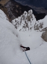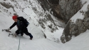 Raggiunto l’imbocco del canale, ci leghiamo e saliamo per divertenti saltelli di neve dura. Raggiunto un bivio, attacchiamo la fessura di destra. Questo è il tratto più impegnativo della via ed effettuiamo un tiro su neve buona, ma a tratti delicata. Oltre proseguiamo in conserva protetta. Il canale finisce in un camino di roccia tappato; usciamo a sinistra su neve non più solida. Da qui guadagniamo il canale della normale camuna (è quello più a destra che punta alla cima, bollo blu all’imbocco), la neve è crostosa e a tratti si affonda. Nel canale la neve torna invece ottima. Seguiamo questo secondo canale non banale, fino a sbucare alla croce di vetta. Discesa per la normale scalvina, condizioni perfette. Bellissimo giro percorso con Mario e Lallo, il concatenamento dei due canali è molto logico e merita veramente. Ambiente dolomitico grandioso. |
