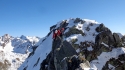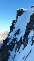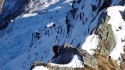 Raggiunto il caratteristico dentino, lo risaliamo come dicono le relazioni (II), ma inutilmente: dall'altra parte precipita una placca strapiombante che costringe a ridiscendere dal medesimo itinerario. Da qui iniziamo a percorrere la cresta, inizialmente pulita e camminabile, ma sempre più sottile ed esposta. Dove la linea si impenna diventando più rocciosa, ci leghiamo procedendo in conserva protetta (presenti anche alcuni chiodi con cordino). Facendo attenzione alle rocce spesso marce, su terreno misto arriviamo ad un profondo intaglio. Lo ridiscendiamo per un canale di neve dura sul versante nord, quindi riguadagniamo il filo della cresta. Da qui in poi non abbiamo più trovato chiodi, ma si riesce a proteggere bene con cordini e friend. Abbiamo così continuato fino a guadagnare la cima dello sperone di Rovere, da dove inizia un lungo tratto piano su terreno scomodo: neve non portante, roccette ed erba. Raggiunto l'ultimo tratto, abbiamo superato una serie di anticime con alcuni passaggi interessanti (in particolare uno speroncino placcoso ed aereo). Superato l'ultimo tratto su neve, abbiamo finalmente toccato la cima del Cadelle. Scesi per la via normale (traccia su neve buona) siamo tornati nuovamente alla frazione di Piano completando il giro ad anello. Cresta davvero lunga; esteticamente non dimostra quello che effettivamente nasconde. Terreno tipicamente orobico. Salita effettuata con Mario e Lallo. |