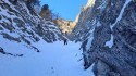 Canale goulotte interessante, da effettuare con innevamento scarso. Da evitare in caso di innevamento abbondante per il notevole pericolo di valanghe. Avvicinamento: Dall'abitato del Laux (park dopo l'omonimo lago) seguire la strada sterrata(innevata) che si inoltra nel vallone dell'Albergian. Proseguire fino al secondo tornante a q.1455 (panchina) e da lì abbandonare la strada, voltare a destra e scendere nel rio, per risalire il canale che sale verso la bastionata rocciosa, fino al primo evidente risalto di ghiaccio (~15-20min). Descrizione: Risalire i primi 4 tiri su ghiaccio con pendenze tra i 60° e i 70°. Soste a spit. (dopo il quarto tiro si puo' scendere in doppia altrimenti si prosegue chiudendo il giro) Proseguire nel canale con pendenze costanti intorno ai 40°-45° e con brevi tratti fino a 60°, dipendentemente dalla quantità di neve (in caso di scarso innevamento sono presenti altri facili risalti di ghiaccio). Salire tutto il canale fino su una dorsale sotto una barriera di rocce. Traversare ora tutto a sinistra e puntare al colletto in alto, attraversare poi alcuni canali cercando di non perdere quota fino ad individuare una vecchia costruzione e più avanti un bel poggio panoramico con un albero solitario. Il sentiero di discesa passa sotto questo ricovero (circa q.2165m) e raggiunge il poggio. Dopo un lungo traverso discendente verso S si passa su una cengia rocciosa attrezzata con catene. Passata questa balza si scende in direzione E fino alla strada che porta alla bergeria del Laux (sentiero con rade tacche bianco/rosse). Dall’uscita del canale calcolare almeno 1h30′ di discesa. Giudizio personale: Bella ” alpinata ” in buone condizioni. La neve in uscita dal canale e nella parte alta non è portante e quindi più faticosa del dovuto. La parte di ghiaccio ed il canale sono di puro divertimento. Il tratto con catene (buona parte sotto neve) si percorre bene, neve ottima. Ora il giro è tutto ben tracciato fino alla prossima neve! Da non sottovalutare la tempistica necessaria anche se con non molto dislivello. Bella salita con l’amico Max NB. Se si " viaggia " bene sulle pendenze indicate, alle condizioni attuali, si può salire senza corda più leggeri guadagnando tempo nella prima parte. |