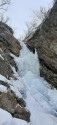 | Commento | Breve e incassata cascata, a destra della ben visibile cascata centrale. La cascata presenta una prima candeletta di una ventina di metri, seguita da una goulotte molto abbattuta. Le condizioni sono buone, anche se i primi metri della candela sono un po' alveolati e ricchi di meduse. Salendo il ghiaccio migliora.