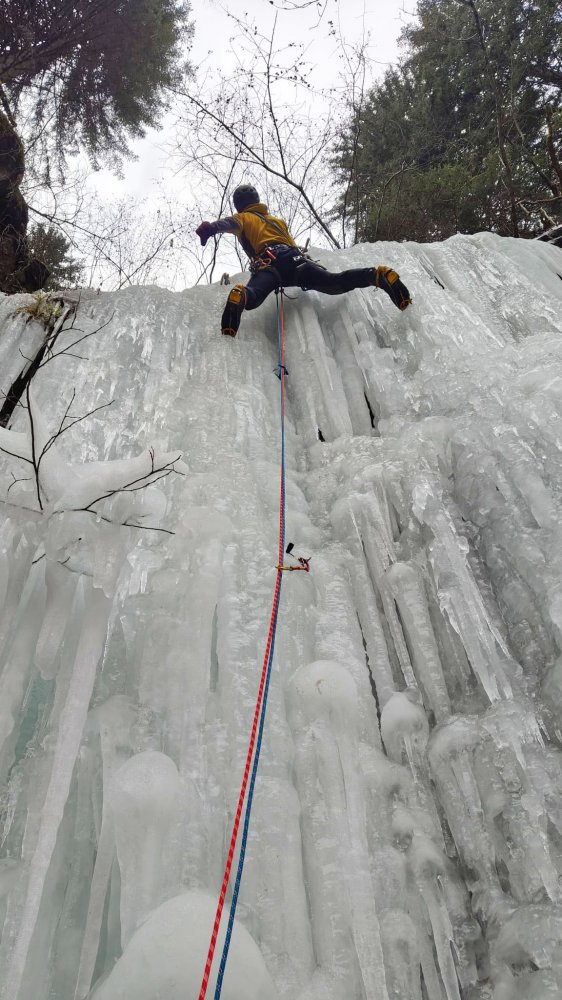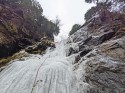 | Commento | Cascata non lunga ma che propone un percorso tecnicamente interessante che abbiamo risolto in tre tiri corti. Oggi ghiaccio plastico e ben lavorato per i piedi, un po' bagnato date le temperature non rigide. Discesa in doppia su piante. Aperta da Mario Sertori e compagni nel 2003, descrizione sul suo libro Cascate - Alpi Centrali.